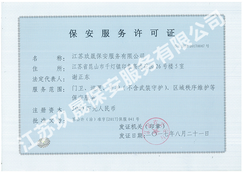 江蘇玖晟保安服務有限公司位于昆山市千燈鎮。注冊資金:5000萬,擁有省公安廳頒發的保安服務許可證的企業,是昆山市保安協會常務理事單位。